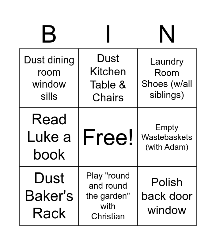 This bingo card has a free space and 8 words: Empty Wastebaskets (with Adam), Laundry Room Shoes (w/all siblings), Dust Kitchen Table & Chairs, Dust Baker's Rack, Dust dining room window sills, Polish back door window, Read Luke a book and Play "round and round the garden" with Christian.