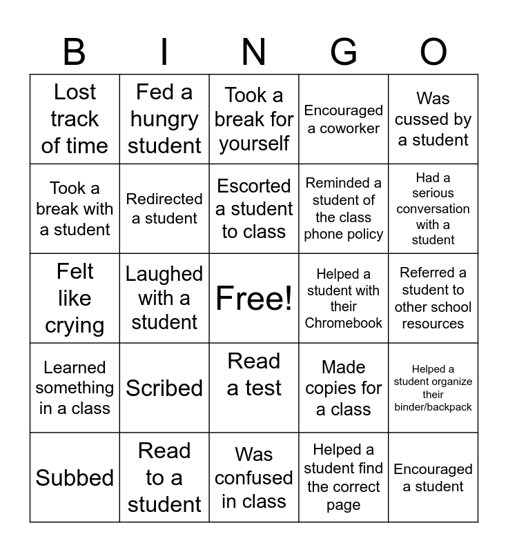 This bingo card has a free space and 24 words: Scribed, Read to a student, Escorted a student to class, Subbed, Was cussed by a student, Lost track of time, Took a break with a student, Fed a hungry student, Helped a student with their Chromebook, Read a test, Reminded a student of the class phone policy, Felt like crying, Made copies for a class, Helped a student organize their binder/backpack, Redirected a student, Helped a student find the correct page, Referred a student to other school resources, Took a break for yourself, Had a serious conversation with a student, Laughed with a student, Encouraged a student, Learned something in a class, Encouraged a coworker and Was confused in class.