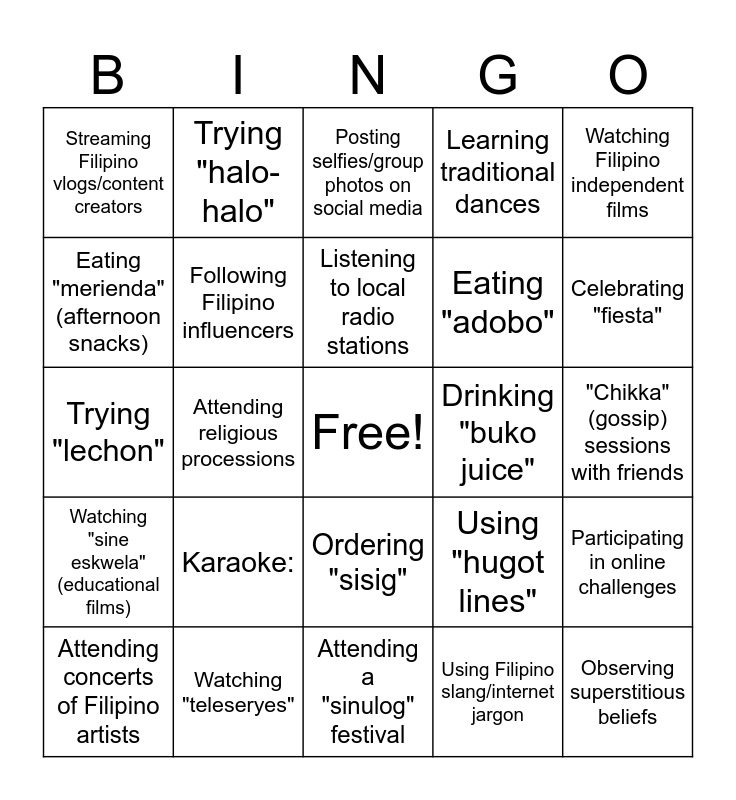 This bingo card has a free space and 24 words: Karaoke:, Watching "teleseryes", Listening to local radio stations, Attending concerts of Filipino artists, Watching Filipino independent films, Streaming Filipino vlogs/content creators, Eating "merienda" (afternoon snacks), Trying "halo-halo", Drinking "buko juice", Ordering "sisig", Eating "adobo", Trying "lechon", Using "hugot lines", Participating in online challenges, Following Filipino influencers, Using Filipino slang/internet jargon, "Chikka" (gossip) sessions with friends, Posting selfies/group photos on social media, Celebrating "fiesta", Attending religious processions, Observing superstitious beliefs, Watching "sine eskwela" (educational films), Learning traditional dances and Attending a "sinulog" festival.
