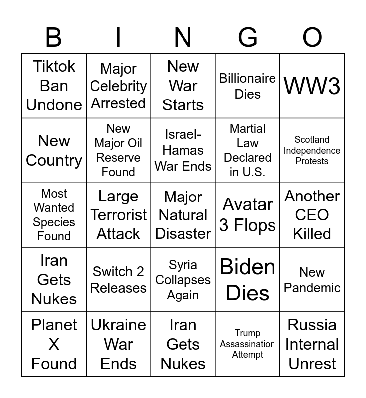 This bingo card has a free space and 24 words: Switch 2 Releases, Ukraine War Ends, Israel-Hamas War Ends, Planet X Found, WW3, Tiktok Ban Undone, New Country, Major Celebrity Arrested, Avatar 3 Flops, Syria Collapses Again, Martial Law Declared in U.S., Most Wanted Species Found, Biden Dies, New Pandemic, New Major Oil Reserve Found, Trump Assassination Attempt, Another CEO Killed, New War Starts, Scotland Independence Protests, Large Terrorist Attack, Russia Internal Unrest, Iran Gets Nukes, Billionaire Dies and Iran Gets Nukes.