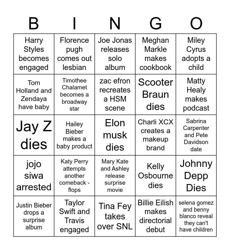 This bingo card has a free space and 24 words: Katy Perry attempts another comeback - flops, Taylor Swift and Travis engaged, zac efron recreates a HSM scene, Justin Bieber drops a surprise album, Miley Cyrus adopts a child, Harry Styles becomes engaged, Tom Holland and Zendaya have baby, Florence pugh comes out lesbian, Charli XCX creates a makeup brand, Mary Kate and Ashley release surprise movie, Scooter Braun dies, Jay Z dies, Kelly Osbourne dies, Johnny Depp Dies, Timothee Chalamet becomes a broadway star, Billie Eilish makes directorial debut, Sabrina Carpenter and Pete Davidson date, Joe Jonas releases solo album, Matty Healy makes podcast, Hailey Bieber makes a baby product, selena gomez and benny blanco reveal they can't have children, jojo siwa arrested, Meghan Markle makes cookbook and Tina Fey takes over SNL.