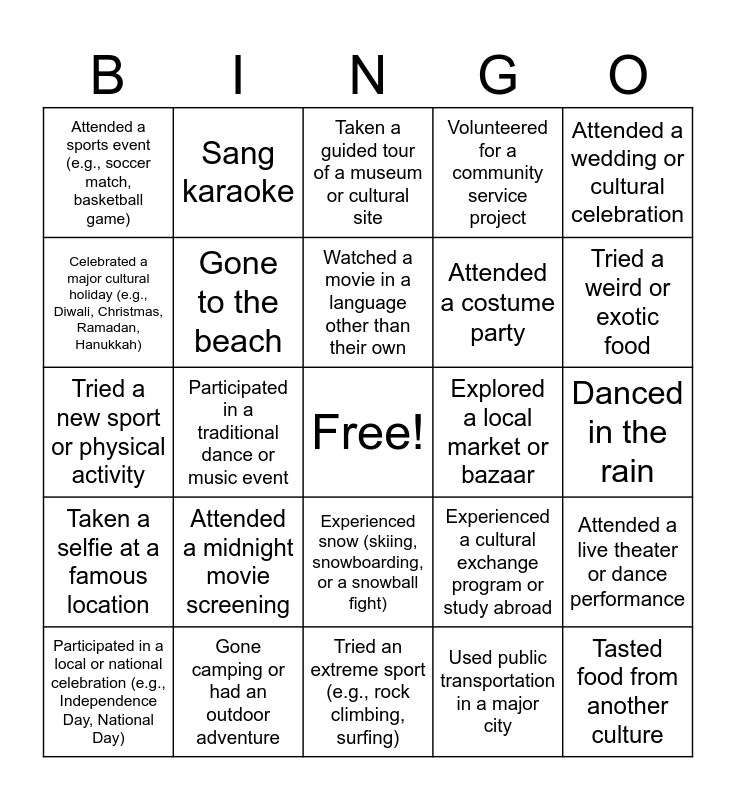 This bingo card has a free space and 35 words: Traveled to a neighboring country, Attended a music festival or concert, Learned to cook a traditional dish from their culture, Gone to the beach, Experienced snow (skiing, snowboarding, or a snowball fight), Volunteered for a community service project, Celebrated a major cultural holiday (e.g., Diwali, Christmas, Ramadan, Hanukkah), Visited a historical monument or landmark, Watched a movie in a language other than their own, Read a book by an author from a different country, Tried a new sport or physical activity, Attended a wedding or cultural celebration, Learned a new skill or hobby (e.g., playing an instrument, painting, knitting), Gone on a road trip, Attended a sports event (e.g., soccer match, basketball game), Explored a local market or bazaar, Used public transportation in a major city, Participated in a traditional dance or music event, Taken a selfie at a famous location, Tasted food from another culture, Experienced a cultural exchange program or study abroad, Participated in a local or national celebration (e.g., Independence Day, National Day), Attended a live theater or dance performance, Gone camping or had an outdoor adventure, Taken a guided tour of a museum or cultural site, Tried a weird or exotic food, Taken a spontaneous trip, Gone zip-lining, Attended a costume party, Danced in the rain, Had a picnic in the park, Tried an extreme sport (e.g., rock climbing, surfing), Attended a midnight movie screening, Sang karaoke and Went to an amusement park and rode a roller coaster.