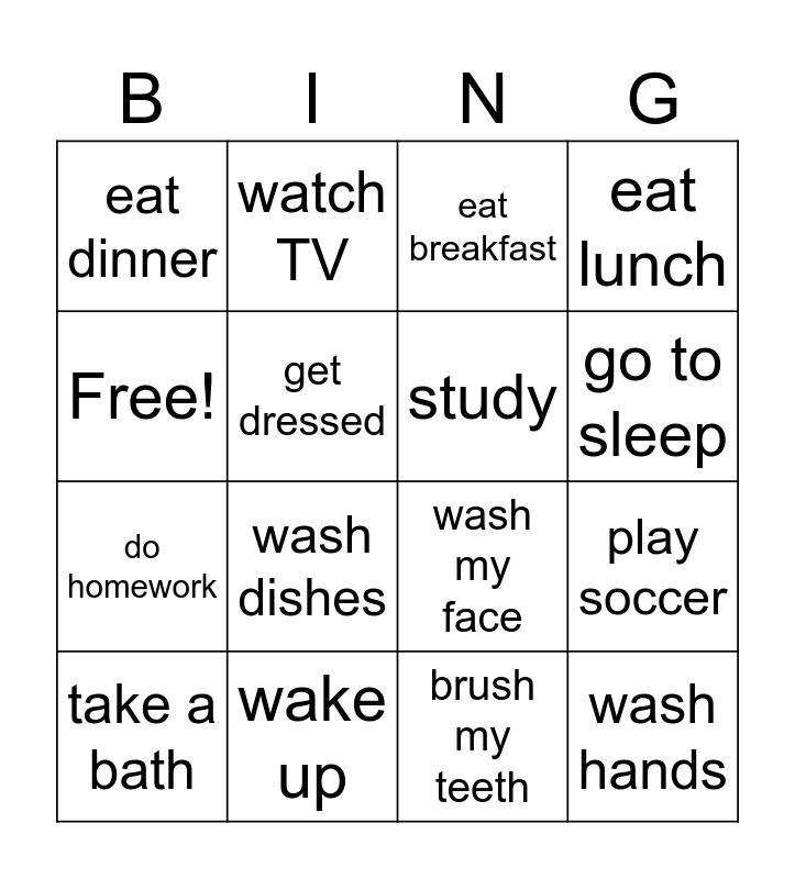 This bingo card has 16 words: wake up, play soccer, eat breakfast, eat dinner, do homework, watch TV, wash my face, brush my teeth, Free!, get dressed, take a bath, eat lunch, wash dishes, go to sleep, study and wash hands.