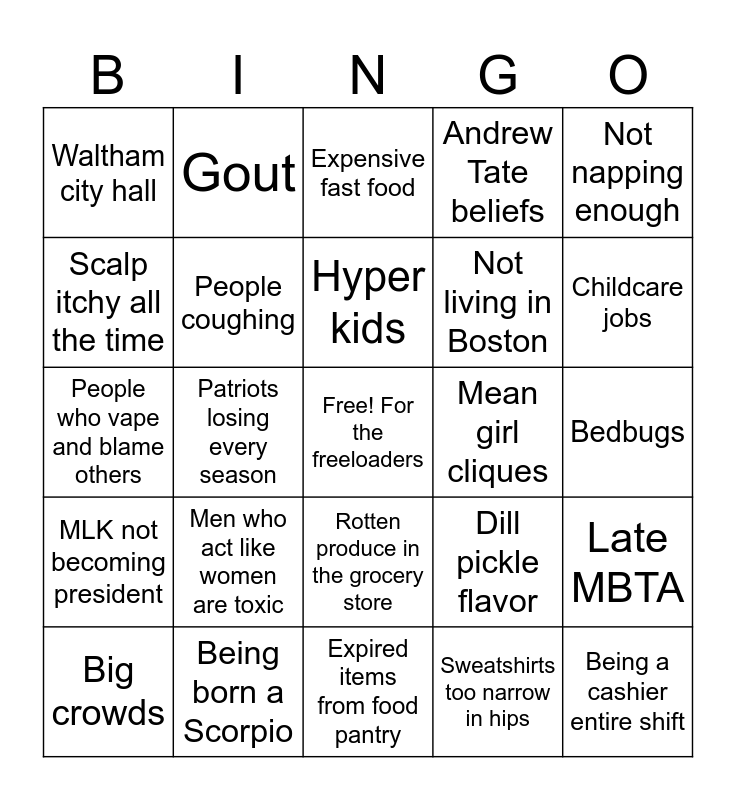 This bingo card has a free space and 24 words: Men who act like women are toxic, Being born a Scorpio, Hyper kids, Big crowds, Not napping enough, Waltham city hall, Scalp itchy all the time, Gout, Mean girl cliques, Rotten produce in the grocery store, Not living in Boston, People who vape and blame others, Dill pickle flavor, Late MBTA, People coughing, Sweatshirts too narrow in hips, Bedbugs, Expensive fast food, Childcare jobs, Patriots losing every season, Being a cashier entire shift, MLK not becoming president, Andrew Tate beliefs and Expired items from food pantry.