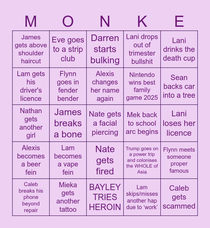 This bingo card has 65 words: Darren sleeps outside (no tent), Nate loses virginity, Umut gets 3 new nicknames, Flynn meets someone proper famous, One of the Gay Monkes dies, Orphix goes viral, Eve goes to a strip club, Darren gets a DUI, Alexis changes her name again, Jenna Marbles returns to youtube, Nate gets fired, Alexis goes clubbing, Lani loses her licence, Lani drinks the death cup, Gay Monke gets/ gets someone else pregnant, Lam gets his driver's licence, James breaks a bone, James gets above shoulder haircut, Darren falls off a roof, Nintendo wins best family game 2025, Lam becomes a vape fein, Alexis becomes a beer fein, Lani drops out of trimester bullshit, Mek leaves Meve's place, Gay Monkes group international trip, Eve & Caleb get dog & treat it like baby, Lani gets new sea creature tattoo (not penguin), Flynn makes Obama his legal middle name, Nate gets a facial piercing, Luigi is found not guilty, Caleb breaks his phone beyond repair, Caleb gets addicted to nicotine, Walter Shaggins McMahon breaks down and needs towing, Alana tries mushrooms and presents neurotypical, Trump goes on a power trip and colonises the WHOLE of Asia, Mieka gets another tattoo, Bayley gets REALLY high at a hap, Nathan gets another girl, Lam skips/misses another hap due to ‘work’, Gay Monke wins the lottery/ wins $10,000+ at casino, Flynn goes in fender bender, Lam involved in pregnancy scare, Mek back to school arc begins, Hemiak (Mek's teacher) files a police report, Luigi Mangione joins a podcast, Bayley moves out, Sean backs car into a tree, Umut requires stomach pumping, Caleb gets scammed, Diddy dies in prison, BUZZ CUT SHRUMI, CALEB WINS BIG ON GAMBLING, SEAN HOSPITALISED, BAYLEY TRIES HEROIN, KFC brings da beef 🥩, Flynn goes to another country (after Feb), Umut gets a girlfriend, Darren starts bulking, James wins best costume for a party, Switch 2 releases before May, Eve starts working at Coles again, Alana gets her driver's licence, Sean quits work at the Homestead, Alexis makes out with someone in the group and A Gay Monke buys their own house.