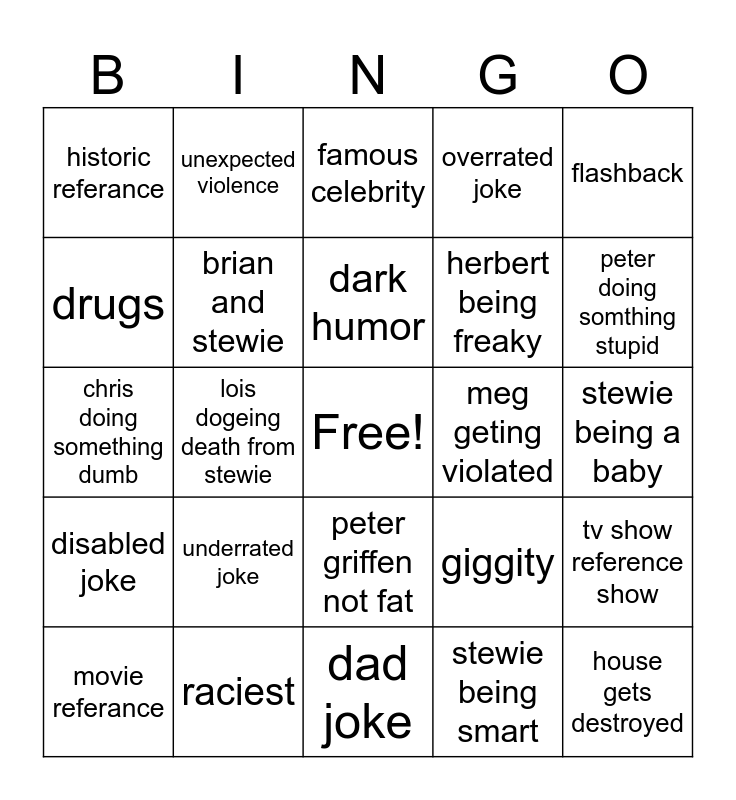 This bingo card has a free space and 24 words: underrated joke, raciest, dark humor, movie referance, flashback, historic referance, drugs, unexpected violence, meg geting violated, peter griffen not fat, herbert being freaky, chris doing something dumb, giggity, tv show reference show, brian and stewie, stewie being smart, stewie being a baby, famous celebrity, peter doing somthing stupid, lois dogeing death from stewie, house gets destroyed, disabled joke, overrated joke and dad joke.