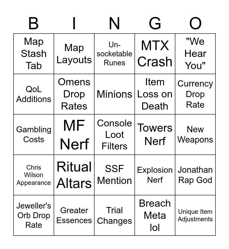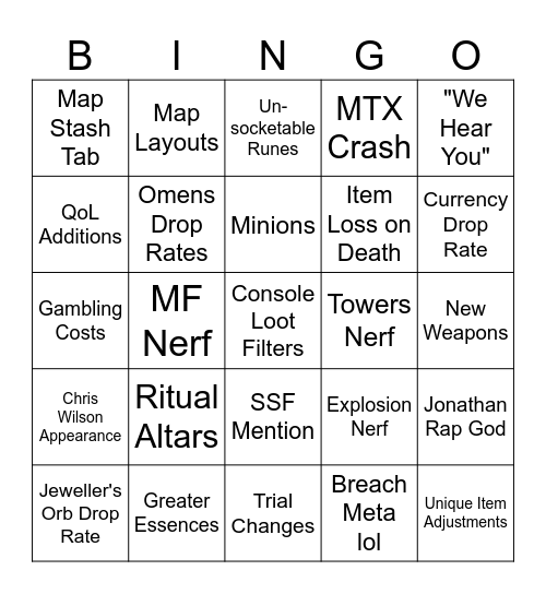 This bingo card has a free space and 24 words: Ritual Altars, Greater Essences, Minions, Jeweller's Orb Drop Rate, "We Hear You", Map Stash Tab, QoL Additions, Map Layouts, Towers Nerf, SSF Mention, Item Loss on Death, Gambling Costs, Explosion Nerf, Jonathan Rap God, Omens Drop Rates, Breach Meta lol, New Weapons, Un-socketable Runes, Currency Drop Rate, MF Nerf, Unique Item Adjustments, Chris Wilson Appearance, MTX Crash and Trial Changes.
