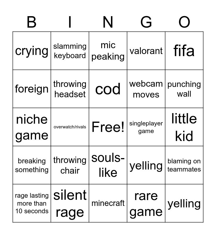 This bingo card has a free space and 36 words: smashing the table, punching monitor, throwing controller, throwing headset, yelling, breaking something, cod, fortnite, fifa, 2k, overwatch/rivals, valorant, female player, singleplayer game, punching wall, crying, rage quit, throwing chair, yelling, mic peaking, little kid, blaming on teammates, silent rage, rage lasting more than 10 seconds, minecraft, slamming keyboard, niche game, player is trash, webcam moves, foreign, rainbow 6 siege, creative insult, rare game, souls-like, mic eating and punching chair.