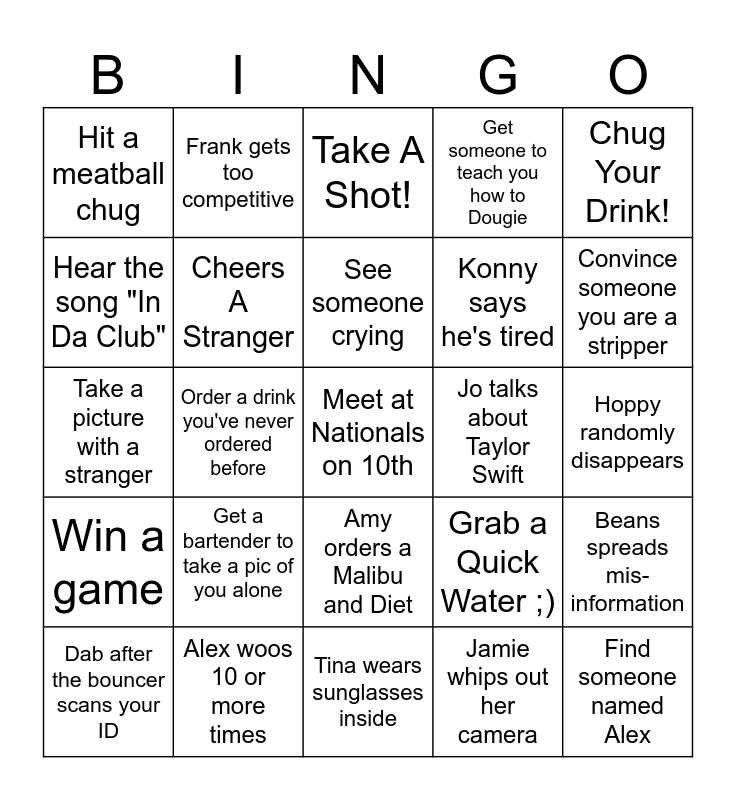 This bingo card has a free space and 24 words: Get a bartender to take a pic of you alone, Alex woos 10 or more times, See someone crying, Dab after the bouncer scans your ID, Chug Your Drink!, Hit a meatball chug, Hear the song "In Da Club", Frank gets too competitive, Jo talks about Taylor Swift, Amy orders a Malibu and Diet, Konny says he's tired, Take a picture with a stranger, Grab a Quick Water ;), Beans spreads mis-information, Cheers A Stranger, Jamie whips out her camera, Hoppy randomly disappears, Take A Shot!, Convince someone you are a stripper, Order a drink you've never ordered before, Find someone named Alex, Win a game, Get someone to teach you how to Dougie and Tina wears sunglasses inside.