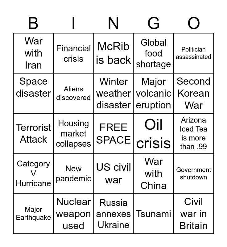 This bingo card has a free space and 24 words: Major Earthquake, New pandemic, Winter weather disaster, Tsunami, Politician assassinated, War with Iran, Financial crisis, McRib is back, Oil crisis, Arizona Iced Tea is more than .99, Terrorist Attack, Aliens discovered, War with China, Government shutdown, Space disaster, Nuclear weapon used, Russia annexes Ukraine, Global food shortage, Second Korean War, Category V Hurricane, Housing market collapses, US civil war, Major volcanic eruption and Civil war in Britain.