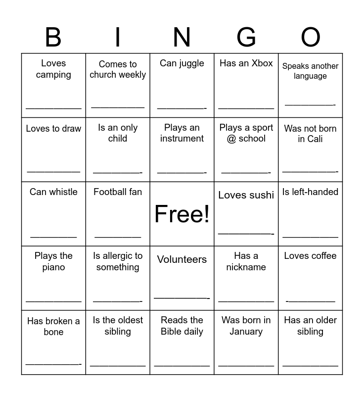 This bingo card has a free space and 24 words: Is allergic to something —————-, Is the oldest sibling ——————, Plays an instrument —————-, Has broken a bone ——————-, Speaks another language ——————-, Loves camping ——————, Loves to draw ——————, Comes to church weekly ——————, Loves sushi —————-, Volunteers —————-, Plays a sport @ school —————-, Can whistle —————, Has a nickname ——————, Loves coffee -—————, Is an only child —————-, Was born in January ——————, Is left-handed ——————, Can juggle —————-, Was not born in Cali ——————-, Football fan —————, Has an older sibling ——————, Plays the piano ——————, Has an Xbox —————— and Reads the Bible daily ——————.