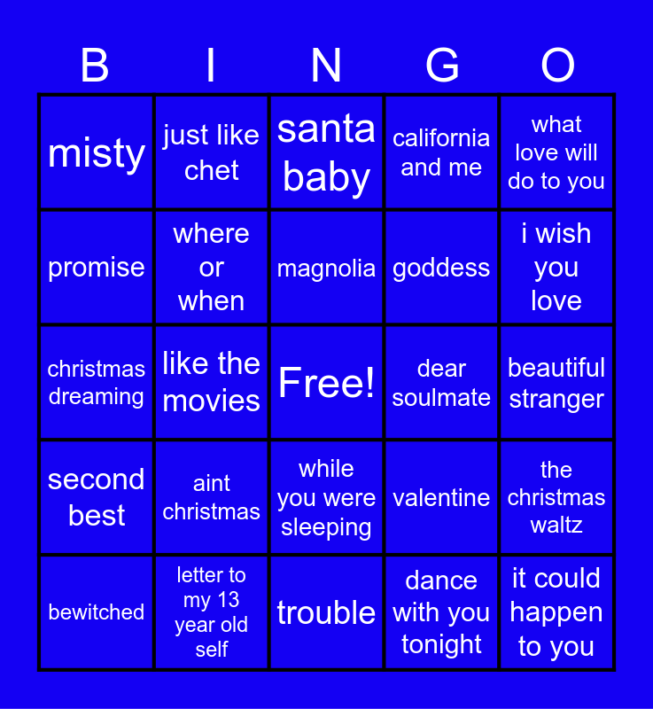 This bingo card has a free space and 54 words: dreamer, second best, haunted, must be love, while you were sleeping, lovesick, california and me, nocturne (interlude), promise, from the start, misty, serendipity, letter to my 13 year old self, bewitched, bored, trouble, it could happen to you, goddess, fragile, beautiful stranger, valentine, above the chinese restaurant, dear soulmate, what love will do to you, ive never been in love before, just like chet, everything i know about love, falling behind, hi, dance with you tonight, night light, slow down, lucky for me, questions for the universe, santa baby, winter wonderland, christmas dreaming, the christmas waltz, love to keep me warm, where or when, bewitched - rework, have yourself a merry little christmas, better than snow, a night to remember, aint christmas, love flew away, let you break my heart again, street by street, magnolia, like the movies, i wish you love, james, someone new and best friend.