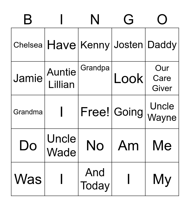 This bingo card has a free space and 79 words: Allie, Cate, Kenny, Kylana, Ryder, Riley, Lauren, Courtney, Cody, Tracyn, Reed, Jill, Josten, Chelsea, Bobby, Jamie, Auntie Cindy, Uncle Wade, Auntie Gale, Uncle Wayne, Mommy Frustrated, Daddy, Grandma, Grandpa, Auntie Lillian, George, Mary, Mom, Was, Nurse Last Night, Our Care Giver, Didn’t Come Yesterday, And Today, I, Was, Going, Pick Up Clothes, I, Thought, My, iPhone, Mom, Came, Do, You, Have, Laundry 🧺, Mom Got me Angry 😡, She, Yelled, Me, I, Am, Frustrated, I, Was, Fixing, My, Bed, No, Look, Fix, To, Me, Yellow Shirt Black shorts, I, Have, Lot, Stuff, Do, I, Am, Not, You’re, Maid, I, Am, Glad and Auntie Gale Coming.
