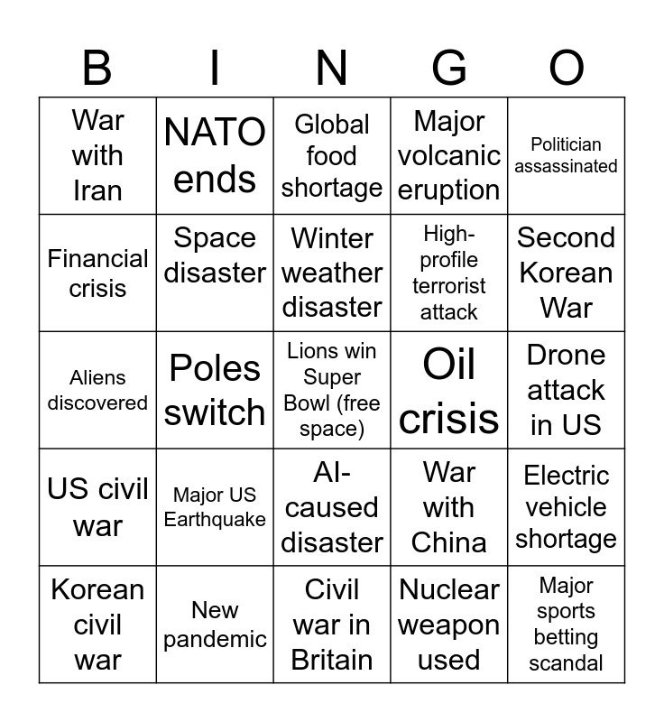 This bingo card has a free space and 24 words: Major US Earthquake, New pandemic, Winter weather disaster, Korean civil war, Politician assassinated, War with Iran, Financial crisis, NATO ends, Oil crisis, AI- caused disaster, High-profile terrorist attack, Aliens discovered, War with China, Electric vehicle shortage, Space disaster, Nuclear weapon used, Drone attack in US, Global food shortage, Second Korean War, Poles switch, Major sports betting scandal, US civil war, Major volcanic eruption and Civil war in Britain.