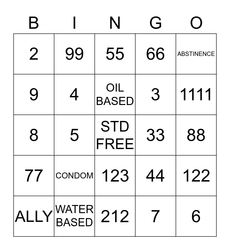 This bingo card has a free space and 24 words: CONDOM, WATER BASED, OIL BASED, ALLY, ABSTINENCE, 2, 9, 99, 33, 123, 3, 8, 44, 122, 4, 7, 88, 55, 1111, 5, 6, 77, 66 and 212.
