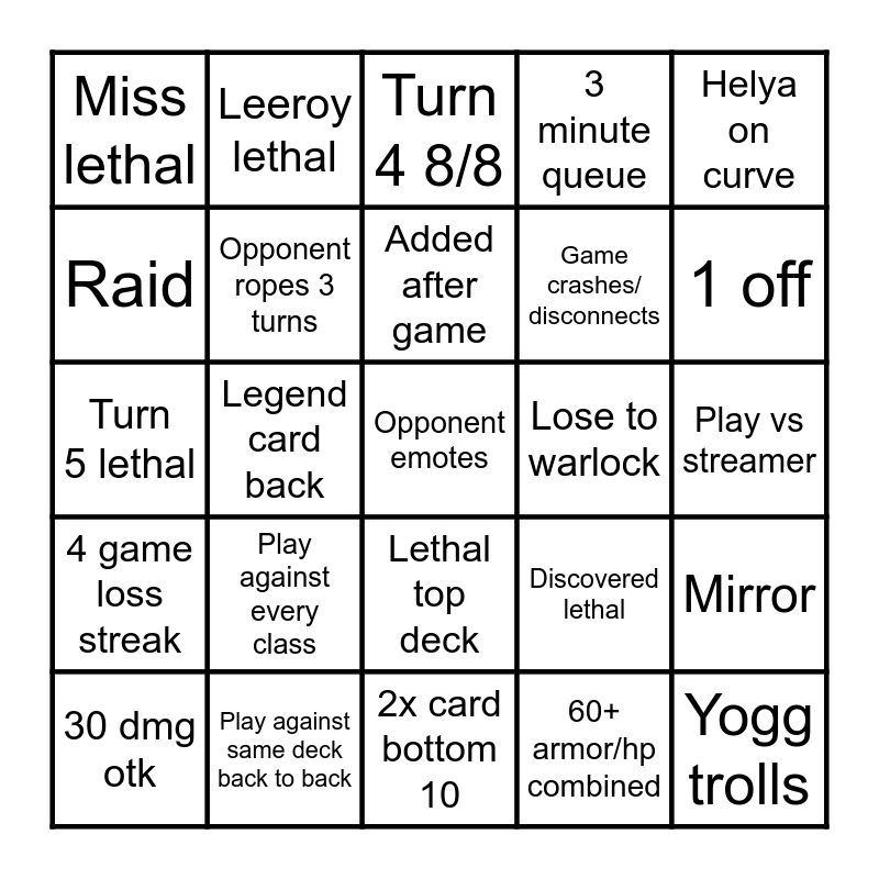 This bingo card has a free space and 24 words: Play against every class, Play against same deck back to back, Added after game, 30 dmg otk, Helya on curve, Miss lethal, Raid, Leeroy lethal, Lose to warlock, Lethal top deck, Game crashes/ disconnects, Turn 5 lethal, Discovered lethal, Mirror, Opponent ropes 3 turns, 60+ armor/hp combined, Play vs streamer, Turn 4 8/8, 1 off, Legend card back, Yogg trolls, 4 game loss streak, 3 minute queue and 2x card bottom 10.