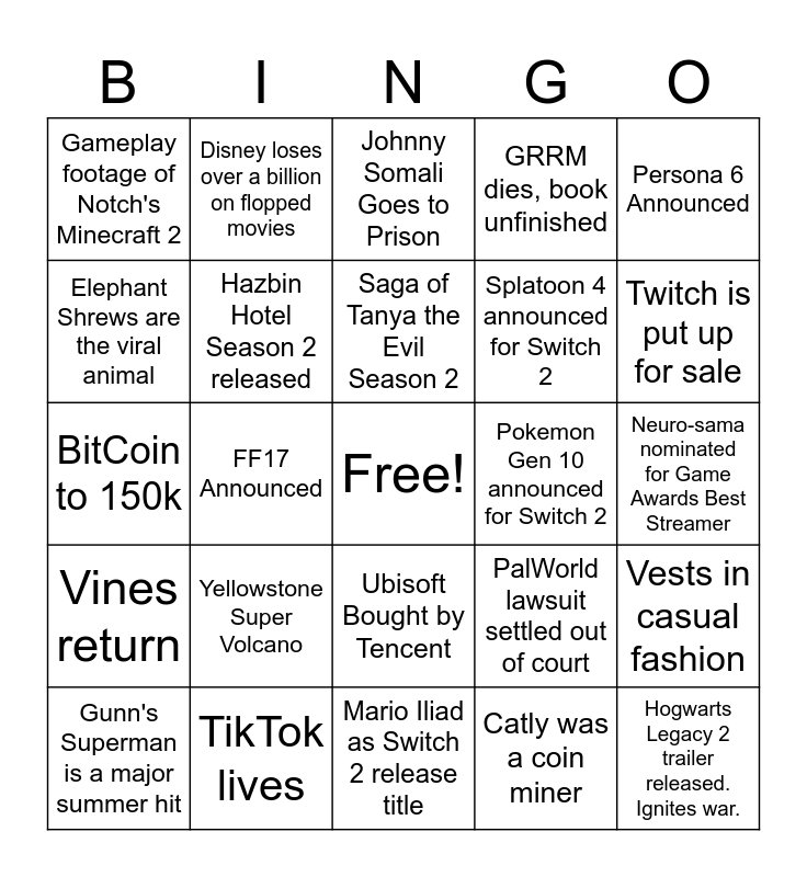 This bingo card has a free space and 24 words: Yellowstone Super Volcano, TikTok lives, Saga of Tanya the Evil Season 2, Gunn's Superman is a major summer hit, Persona 6 Announced, Gameplay footage of Notch's Minecraft 2, Elephant Shrews are the viral animal, Disney loses over a billion on flopped movies, Pokemon Gen 10 announced for Switch 2, Ubisoft Bought by Tencent, Splatoon 4 announced for Switch 2, BitCoin to 150k, PalWorld lawsuit settled out of court, Vests in casual fashion, Hazbin Hotel Season 2 released, Catly was a coin miner, Neuro-sama nominated for Game Awards Best Streamer, Johnny Somali Goes to Prison, Twitch is put up for sale, FF17 Announced, Hogwarts Legacy 2 trailer released. Ignites war., Vines return, GRRM dies, book unfinished and Mario Iliad as Switch 2 release title.
