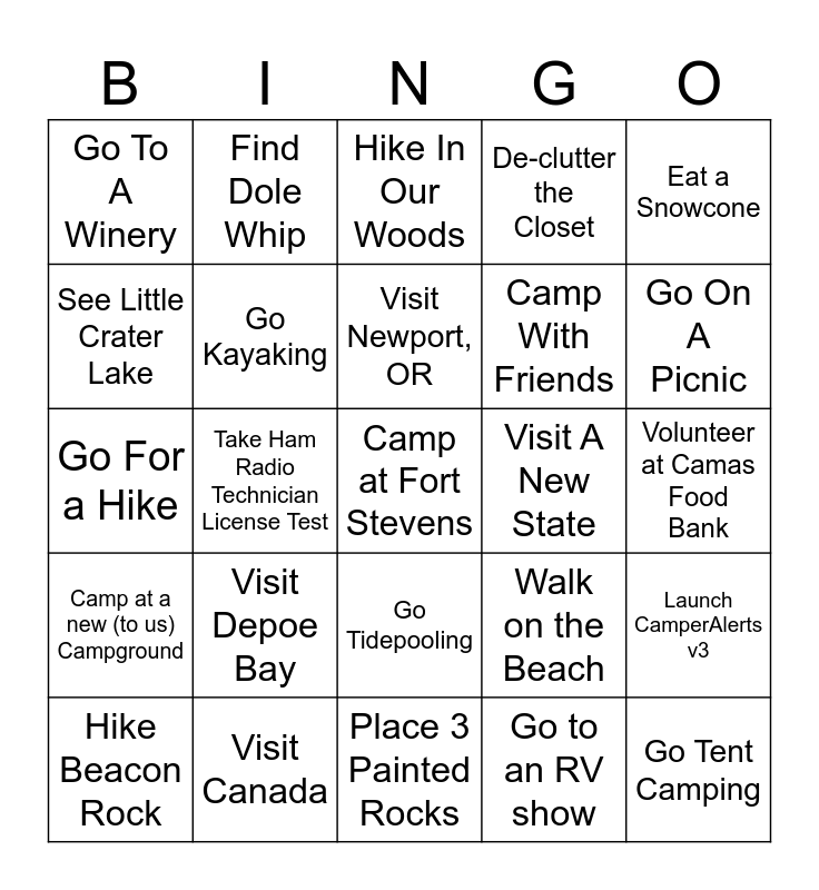 This bingo card has a free space and 24 words: Visit Depoe Bay, Visit Canada, Visit Newport, OR, Hike Beacon Rock, Eat a Snowcone, Go To A Winery, See Little Crater Lake, Find Dole Whip, Visit A New State, Go Tidepooling, Camp With Friends, Go For a Hike, Walk on the Beach, Launch CamperAlerts v3, Go Kayaking, Go to an RV show, Volunteer at Camas Food Bank, Hike In Our Woods, Go On A Picnic, Take Ham Radio Technician License Test, Go Tent Camping, Camp at a new (to us) Campground, De-clutter the Closet and Place 3 Painted Rocks.