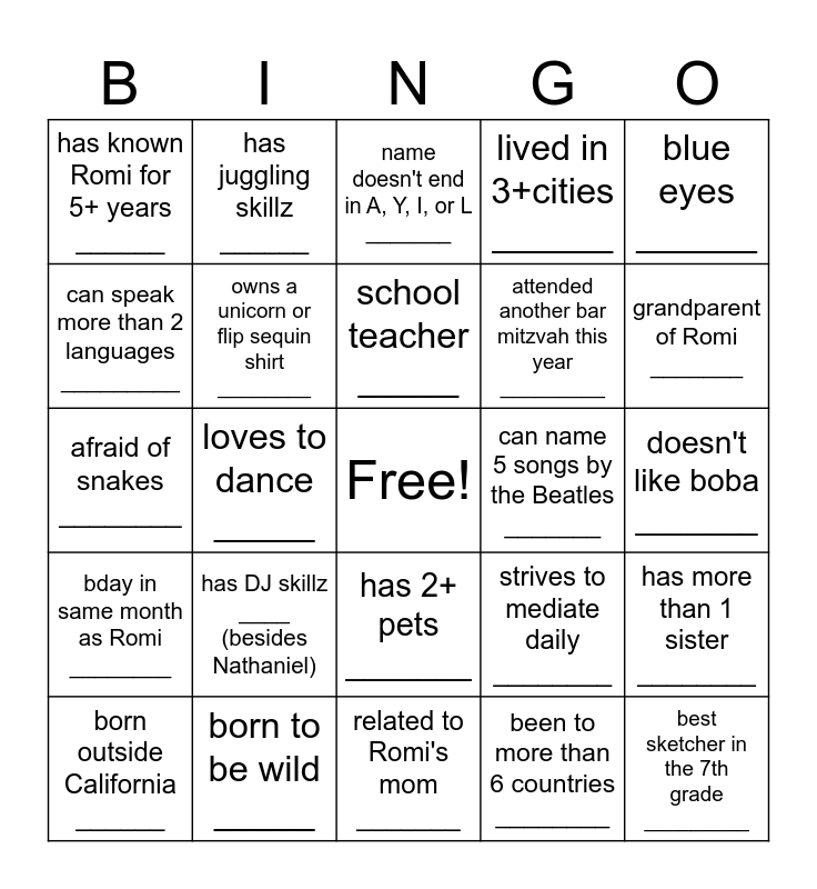 This bingo card has a free space and 24 words: has DJ skillz ____ (besides Nathaniel), born to be wild _____, school teacher _____, born outside California ______, blue eyes ______, has known Romi for 5+ years ______, can speak more than 2 languages _________, has juggling skillz ______, can name 5 songs by the Beatles _______, has 2+ pets _______, attended another bar mitzvah this year _________, afraid of snakes ________, strives to mediate daily ________, has more than 1 sister ________, owns a unicorn or flip sequin shirt ________, been to more than 6 countries ________, doesn't like boba _______, name doesn't end in A, Y, I, or L _______, grandparent of Romi _______, loves to dance _____, best sketcher in the 7th grade _________, bday in same month as Romi ________, lived in 3+cities ______ and related to Romi's mom _______.