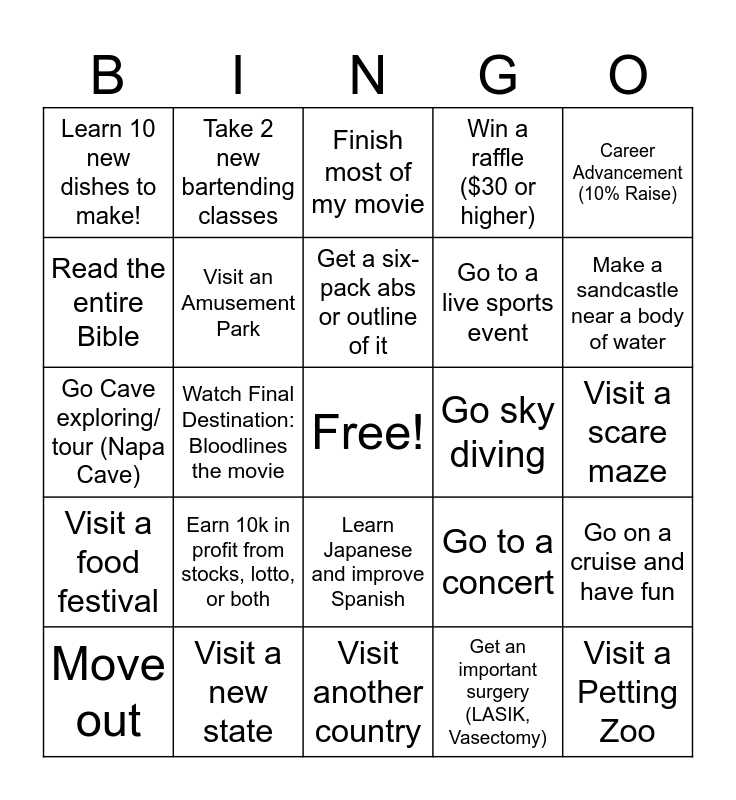 This bingo card has a free space and 24 words: Earn 10k in profit from stocks, lotto, or both, Visit a new state, Get a six-pack abs or outline of it, Move out, Career Advancement (10% Raise), Learn 10 new dishes to make!, Read the entire Bible, Take 2 new bartending classes, Go sky diving, Learn Japanese and improve Spanish, Go to a live sports event, Go Cave exploring/ tour (Napa Cave), Go to a concert, Go on a cruise and have fun, Visit an Amusement Park, Get an important surgery (LASIK, Vasectomy), Visit a scare maze, Finish most of my movie, Make a sandcastle near a body of water, Watch Final Destination: Bloodlines the movie, Visit a Petting Zoo, Visit a food festival, Win a raffle ($30 or higher) and Visit another country.