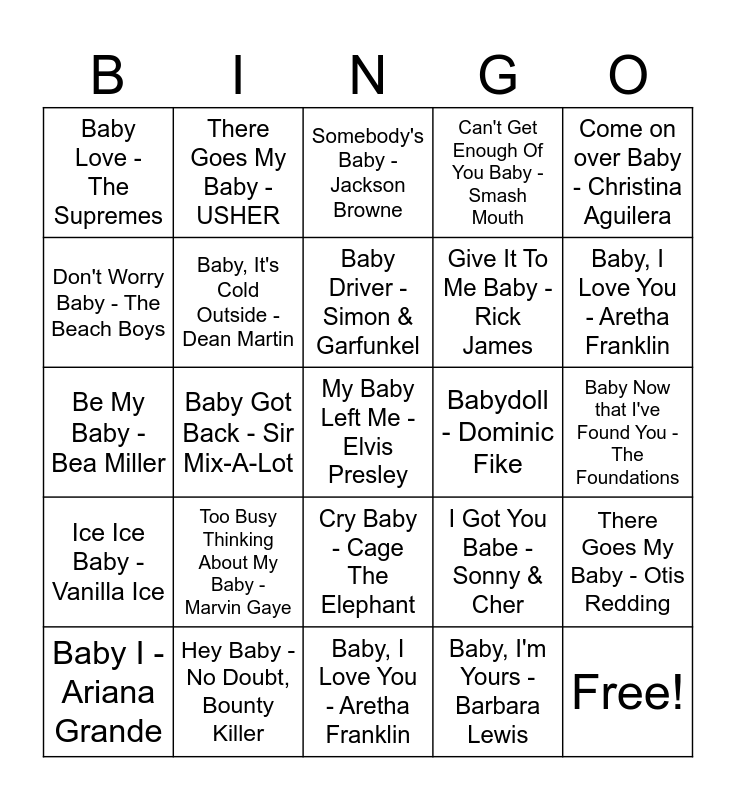 This bingo card has 33 words: Free!, Baby - Justin Bieber, Ludacris, Baby Got Back - Sir Mix-A-Lot, ...Baby One More Time - Britney Spears, Ice Ice Baby - Vanilla Ice, Baby, It's Cold Outside - Dean Martin, Come on over Baby - Christina Aguilera, Baby I - Ariana Grande, There Goes My Baby - USHER, Always Be My Baby - Mariah Carey, Baby Driver - Simon & Garfunkel, Somebody's Baby - Jackson Browne, Hey Baby - Pitbull, T-Pain, Baby Don't Lie - Gwen Stefani, Babydoll - Dominic Fike, Baby, I Love You - Aretha Franklin, Hey Baby - No Doubt, Bounty Killer, Be My Baby - Bea Miller, Too Busy Thinking About My Baby - Marvin Gaye, I Got You Babe - Sonny & Cher, Cry Baby - Cage The Elephant, Runaway Baby - Bruno Mars, Baby Love - The Supremes, Baby Now that I've Found You - The Foundations, Baby, I Love You - Aretha Franklin, My Baby Left Me - Elvis Presley, Can't Get Enough Of You Baby - Smash Mouth, Give It To Me Baby - Rick James, Don't Worry Baby - The Beach Boys, There Goes My Baby - Otis Redding, One For My Baby - Frank Sinatra, Baby, I'm Yours - Barbara Lewis and My Baby - Janet Jackson, Kanye West.