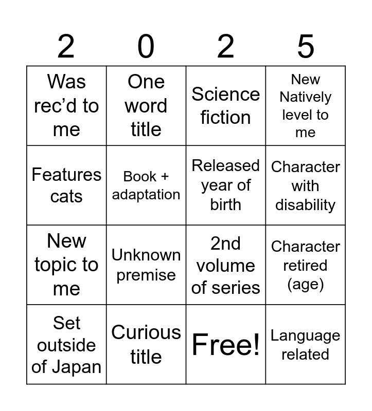 This bingo card has 26 words: Keep hearing about it, Natively - no ratings, Character with disability, Favorite color cover, Features cats, Was rec’d to me, Book + adaptation, One word title, Free!, Someone else’s card, New topic to me, 2nd volume of series, Past book club, Set where I’ve lived, Character retired (age), Title includes number, New Natively level to me, Language related, Science fiction, Set outside of Japan, Unknown premise, Non-human protagonist, Curious title, Seeking Rec’s thread, Released year of birth and Unusual genre to me.