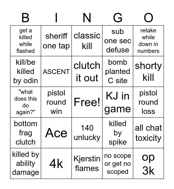 This bingo card has a free space and 24 words: Ace, 4k, clutch it out, killed by ability damage, retake while down in numbers, get a killed while flashed, kill/be killed by odin, sheriff one tap, KJ in game, 140 unlucky, bomb planted C site, "what does this do again?", killed by spike, all chat toxicity, ASCENT, no scope or get no scoped, pistol round loss, classic kill, shorty kill, pistol round win, op 3k, bottom frag clutch, sub one sec defuse and Kjerstin flames.