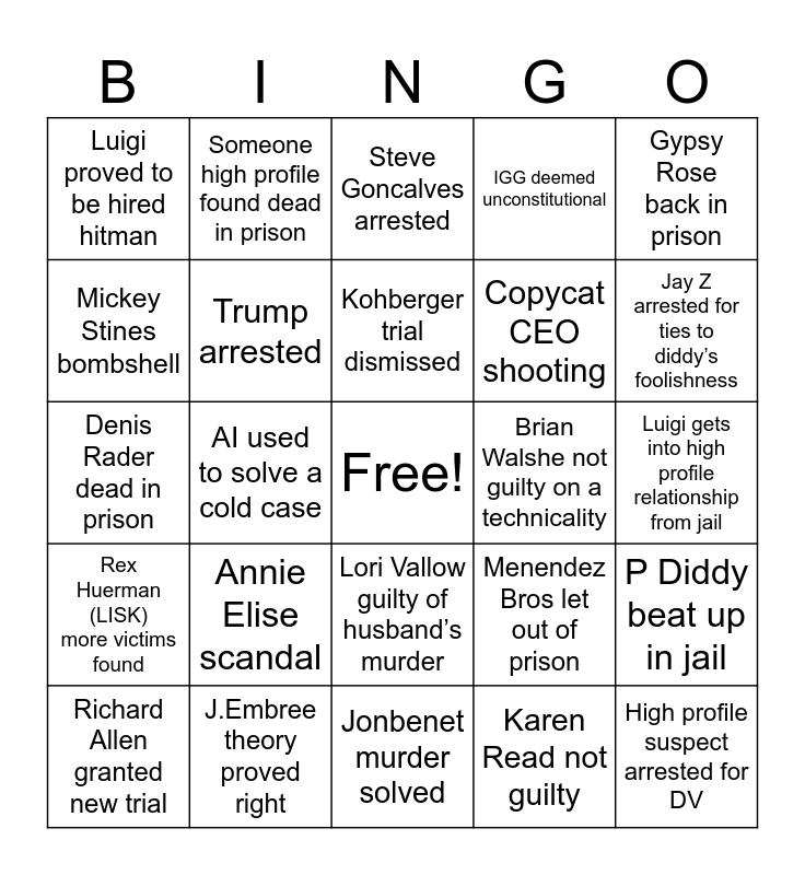 This bingo card has a free space and 24 words: Annie Elise scandal, J.Embree theory proved right, Kohberger trial dismissed, Richard Allen granted new trial, Gypsy Rose back in prison, Luigi proved to be hired hitman, Mickey Stines bombshell, Someone high profile found dead in prison, Brian Walshe not guilty on a technicality, Lori Vallow guilty of husband’s murder, Copycat CEO shooting, Denis Rader dead in prison, Menendez Bros let out of prison, P Diddy beat up in jail, Trump arrested, Karen Read not guilty, Luigi gets into high profile relationship from jail, Steve Goncalves arrested, Jay Z arrested for ties to diddy’s foolishness, AI used to solve a cold case, High profile suspect arrested for DV, Rex Huerman (LISK) more victims found, IGG deemed unconstitutional and Jonbenet murder solved.