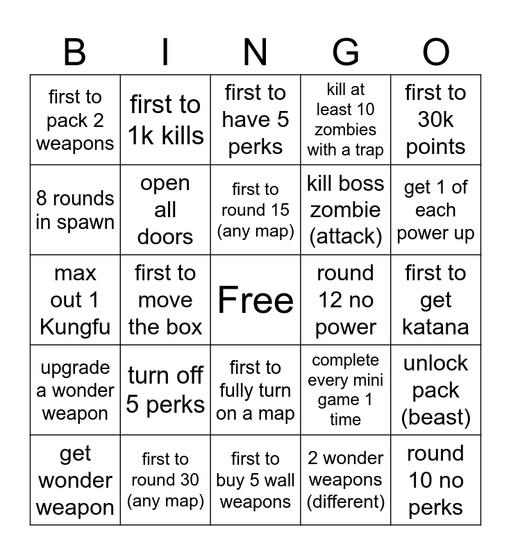 This bingo card has a free space and 24 words: turn off 5 perks, first to round 30 (any map), first to round 15 (any map), get wonder weapon, first to 30k points, first to pack 2 weapons, 8 rounds in spawn, first to 1k kills, round 12 no power, first to fully turn on a map, kill boss zombie (attack), max out 1 Kungfu, complete every mini game 1 time, unlock pack (beast), open all doors, 2 wonder weapons (different), first to get katana, first to have 5 perks, get 1 of each power up, first to move the box, round 10 no perks, upgrade a wonder weapon, kill at least 10 zombies with a trap and first to buy 5 wall weapons.