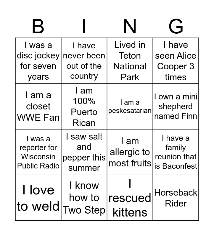 This bingo card has a free space and 15 words: I love to weld, Horseback Rider, Lived in Teton National Park, I was a disc jockey for seven years, I own a mini shepherd named Finn, I am a closet WWE Fan, I saw salt and pepper this summer, I rescued kittens, I am 100% Puerto Rican, I was a reporter for Wisconsin Public Radio, I have a family reunion that is Baconfest, I have seen Alice Cooper 3 times, I am a peskesatarian, I have never been out of the country and I know how to Two Step.