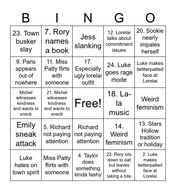 This bingo card has a free space and 48 words: 1. Coffee addiction mention, 2. Luke makes twitterpatted face at Lorelai, 3. Luke hates on town spirit, 4. Taylor does something kinda fashy, 5. Richard not paying attention, 6. Emily sneak attack, 7. Rory names a book, 8. Dean is most boring jakey moment, 9. Paris appears out of nowhere, 10. Lane is grounded, 11. Miss Patty flirts with someone, 12. Lorelai talks about commitment issues, 13. Stars Hollow tradition or holiday, 14. Weird feminism, 15. Mean-spirited joke about minority, 16. Kirk gets new job, 17. Especially ugly lorelai outfit, 18. La-la music, 19. Jess slanking, 20. Sookie nearly impales herself, 21. Michel witnesses kindness and wants to sneck, 22. Rory sits down to eat but leaves without taking a bite, 23. Town busker slay, 24. Luke goes rage mode, Coffee addiction mention, Luke makes twitterpatted face at Lorelai, Luke hates on town spirit, Taylor does something kinda fashy, Richard not paying attention, Emily sneak attack, Rory names a book, Dean is most boring jakey moment, Paris appears out of nowhere, Lane is grounded, Miss Patty flirts with someone, Lorelai talks about commitment issues, Stars Hollow tradition or holiday, Weird feminism, Mean-spirited joke about minority, Kirk gets new job, Especially ugly lorelai outfit, La-la music, Jess slanking, Sookie nearly impales herself, Michel witnesses kindness and wants to sneck, Rory sits down to eat but leaves without taking a bite, Town busker slay and Luke goes rage mode.