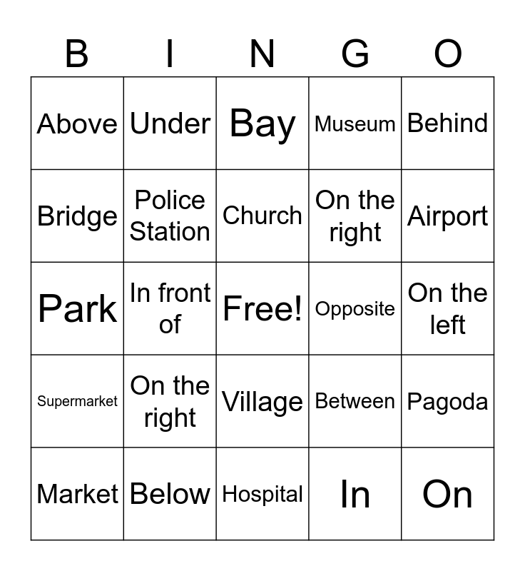 This bingo card has a free space and 24 words: On the right, Below, Church, Market, Behind, Above, Bridge, Under, Opposite, Village, On the right, Park, Between, Pagoda, Police Station, In, On the left, Bay, Airport, In front of, On, Supermarket, Museum and Hospital.