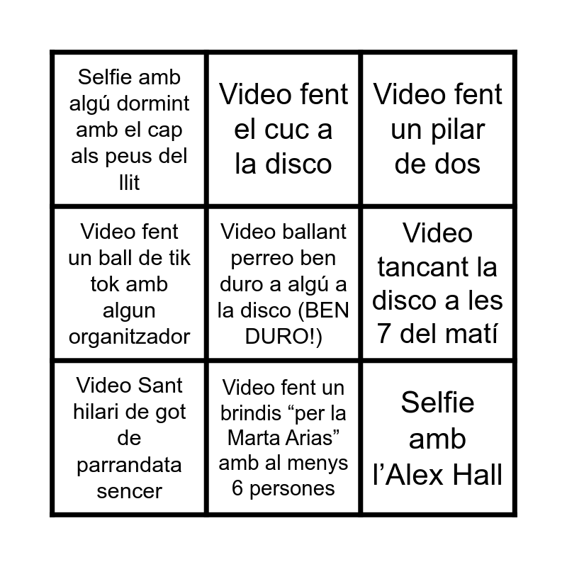 This bingo card has 61 words: Selfie amb algú vomitant, Selfie amb l’emu, Selfie amb una gallina, Selfie amb un burro, Video fent un chapuzon a la piscina, Selfie amb una parelleta fent-se petonets de fons, Video Sant hilari de got de parrandata sencer, Selfie amb el Biel Fortuny, Selfie amb l’Alex Hall, Selfie amb en Pablo Gete, Video fent un ball de tik tok amb algun organitzador, Video sent entrevistat pel Joan Esteban, Video tancant la disco a les 7 del matí, Video al lavabo mentre algú està vomitant al del costat, Video simulant que ets el tió de nadal, Selfie amb algú dormint amb el cap als peus del llit, Selfie amb una parelleta dormint al costat juntets, Video ballant perreo ben duro a algú a la disco (BEN DURO!), Video cantant una sardina i que algú et segueixi, Video fent un brindis “per la Marta Arias” amb al menys 6 persones, Selfie amb una birra a la mà i amb un cubata a l’altra amb algun animal de fons, Video fent un pilar de dos, Video ficant una papereta dient: “em tiraria al Joan Gomà si no estigués ocupat” de part d’un anònim a la caixa dels somnis, Video fent el pi en un arbre de fora, Video fent pessigolles a algú que no coneixes, Video fent una sentadilla mentres tens un got ple/birra al cap, Foto descalç a la disco mentres hi ha gent ballant, Selfie fregant el terra, Selfie netejant els lavabos, Selfie amb un cuiner, Video fent un Sant hilari de suc per esmorzar, Foto amb un cfis (o selfie amb un altre si ho ets), Video imitant en shin chan en un video (no si val uo nevado), Foto que la teva manta és alguna cosa completament random menys una manta, Video fent el cuc a la disco, Fer un verd al jutge durant el finde (apanyateles amb el movil), Foto mossegant el cul d'algú altre (s’hi val el burro sense fer-li mal), Foto de com has pintat la cara d’algú que està dormint, Video ficant una cistella des de fora el terra cimentat (des d’on hi ha gespa i terra), Foto de 15 parells de sabates robades, Video imitant el Toni Cruanyes, Video imitant en Tomàs Molina, Video amb l’ajuda d'algú altre recreeu el ball de l’àliga de la Patum, Foto amb el dit dins la paella mentre es fa, Foto amb algun tatuatge (de pintura) a la cara o al pit posant: “in a relationship with Marta Arias / Anna Rio” o “I love Marta Arias / Anna Rio”, Video senyalant a dos persones que creus que s’han de liar i enviar-ho al grup de Team Dades, Video bevent a totes les preguntes del Jo Mai Mai, Foto pikete CR7 (envia una foto a team dades amb un bon pikete i fes una enquesta per que la gent puntui pikete), Video enviant a Team Dades un audio explicant com s’escriu “chack-chack” i per què, Foto amb una persona dormida a la que li hagis posat pasta de dents a la cara, Video robant a algú que estigui dormint la manta i que et persegueixi, Selfie amb una persona que no sigui actualment de la carrera, Video ensenyant ubicació google maps a al menys 1 km de la casa (val demostrar-ho amb el pokemon go), Video fent un ball del fortnite a la disco, Tik tok de ‘controlando la bebida’ on aparegui algun mentor controlant el cubata amb el genoll i 5 persones més, Foto superesmorza: Cafè i cigarro, Video fent un calvo ràpid i tontorron, Fer una corona amb un paper i celo i posarli a qui es mereix ser el teu rei/reina. (Foto de la persona amb la corona), Foto imitant el caganer del pessebre, Video a la disco com el capità calçotets (és a dir calcetes o calçotets al cap i a ballar) and Foto fent pipí de la mà al labavo de baix.