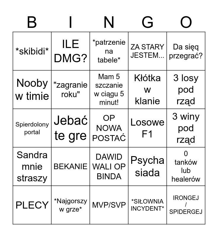 This bingo card has 25 words: BEKANIE, MVP/SVP, Mam 5 szczanie w ciągu 5 minut!, PLECY, Da sięq przegrać?, *skibidi*, Nooby w timie, ILE DMG?, Losowe F1, DAWID WALI OP BINDA, Kłótka w klanie, Spierdolony portal, Psycha siada, 0 tanków lub healerów, "zagranie roku", IRONGEJ / SPIDERGEJ, 3 winy pod rząd, *patrzenie na tabele*, 3 losy pod rząd, Jebać te gre, OP NOWA POSTAĆ, *Najgorszy w grze*, Sandra mnie straszy, ZA STARY JESTEM... and *SIŁOWNIA INCYDENT*.