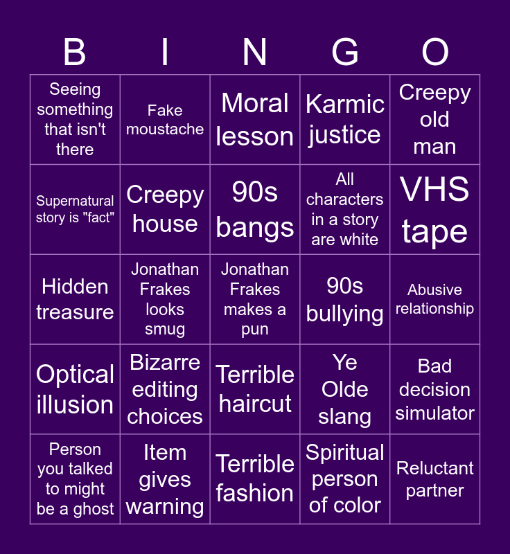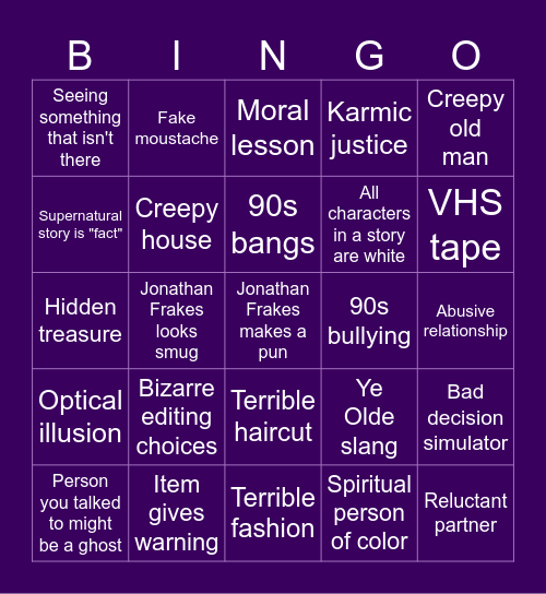 This bingo card has a free space and 40 words: Animal knows, Hidden treasure, Inheritance, Creepy house, Item gives warning, Terrible haircut, 90s bangs, Awful flirting, Creepy old man, Optical illusion, Jonathan Frakes looks smug, Karmic justice, Reluctant partner, Abusive relationship, 90s bullying, Bizarre editing choices, Spooky ghost, Seeing something that isn't there, Bad midi music, Moral lesson, Bad decision simulator, Spiritual person of color, All characters in a story are white, Supernatural story is "fact", Miraculous healing, Abandoned / unoccupied house, Unlikely coincidence, HOPE DESTINY LOVE FATE, Was it just their imagination?, Historical, Bad hair dye, Person you talked to might be a ghost, Bad lighting, Ye Olde slang, VHS tape, Terrible fashion, "a similar incident took place", All scenery looks like California, Fake moustache and Robert Trailins.