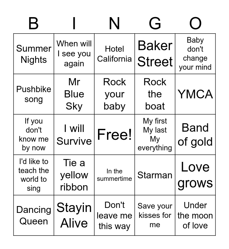 This bingo card has a free space and 29 words: Dancing Queen, Love Train, I will Survive, Rivers of Babylon, Summer Nights, Hotel California, Mr Blue Sky, Tie a yellow ribbon, My first My last My everything, Stayin Alive, Band of gold, Under the moon of love, Don't leave me this way, Save your kisses for me, YMCA, I'm every woman, In the summertime, I'd like to teach the world to sing, Baby don't change your mind, If you don't know me by now, Starman, The wonder of you, Rock the boat, Pushbike song, Baker Street, When will I see you again, Love grows, Rock your baby and Hey girl don't bother me.