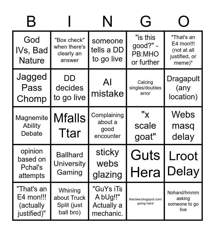 This bingo card has a free space and 24 words: Ballhard University Gaming, Whining about Truck Split (just ball bro), AI mistake, "That's an E4 mon!!! (actually justified)", "That's an E4 mon!!! (not at all justified, or meme)", God IVs, Bad Nature, Jagged Pass Chomp, "Box check" when there's clearly an answer, "x scale goat", sticky webs glazing, Calcing singles/doubles error, Magnemite Ability Debate, Guts Hera, Lroot Delay, DD decides to go live, theclew.blogspot.com going hard, Webs masq delay, someone tells a DD to go live, Dragapult (any location), Mfalls Ttar, Nohand/hmmm asking someone to go live, opinion based on Pchal's attempts, "is this good?" - PB:MHO or further and "GuYs iTs A bUg!!" Actually a mechanic..