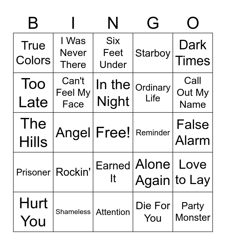 This bingo card has a free space and 41 words: Often, The Hills, Acquainted, Can't Feel My Face, Shameless, Earned It, In the Night, As You Are, Dark Times, Prisoner, Angel, Starboy, Party Monster, False Alarm, Reminder, Rockin', Secrets, True Colors, Sidewalks, Six Feet Under, Love to Lay, A Lonely Night, Attention, Ordinary Life, Nothing Without You', All I Know, Die For You, I Feel It Coming, Call Out My Name, Try Me, Wasted Times, I Was Never There, Hurt You, Privilege, Alone Again, Too Late, Hardest To Love, Scared To Live, Snow Child, Escape From LA and Heartless.