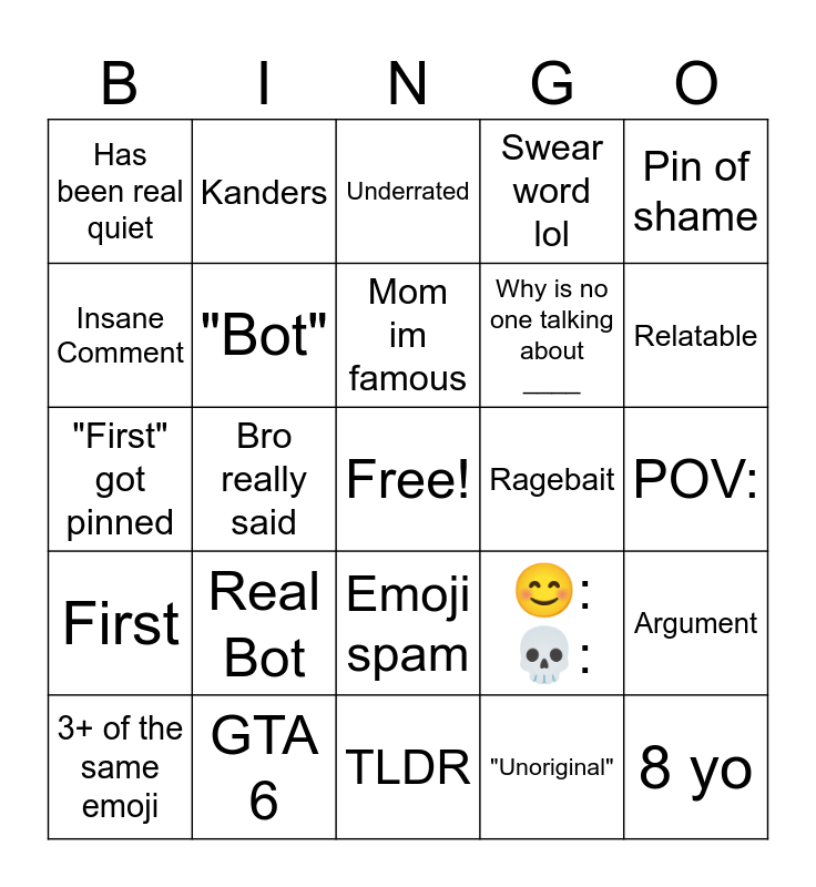 This bingo card has a free space and 29 words: 3+ of the same emoji, 😊❤️🥳, Bro really said, Thought we wouldn't notice, Has been real quiet, Underrated, "Bot", Real Bot, Ragebait, GTA 6, POV:, 8 yo, TLDR, "Unoriginal", Relatable, Actually Funny, Emoji spam, First, Pin of shame, "First" got pinned, 😊: 💀:, ❌: ✅:, Why is no one talking about ____, Insane Comment, Swear word lol, Kanders, Argument, Mom im famous and Edit:.