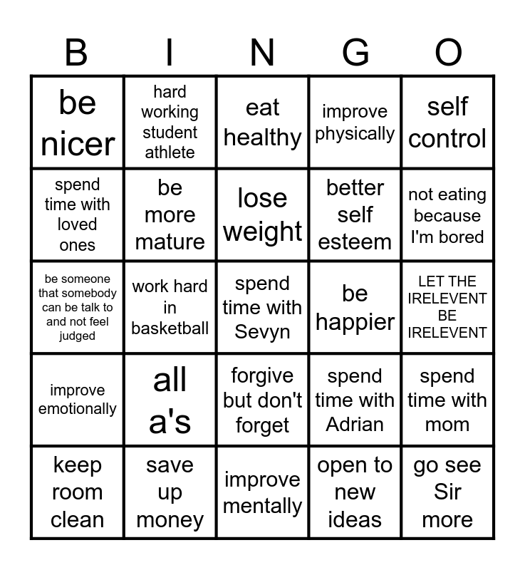 This bingo card has a free space and 24 words: all a's, save up money, lose weight, keep room clean, self control, be nicer, spend time with loved ones, hard working student athlete, be happier, forgive but don't forget, better self esteem, be someone that somebody can be talk to and not feel judged, spend time with Adrian, spend time with mom, be more mature, open to new ideas, LET THE IRELEVENT BE IRELEVENT, eat healthy, not eating because I'm bored, work hard in basketball, go see Sir more, improve emotionally, improve physically and improve mentally.