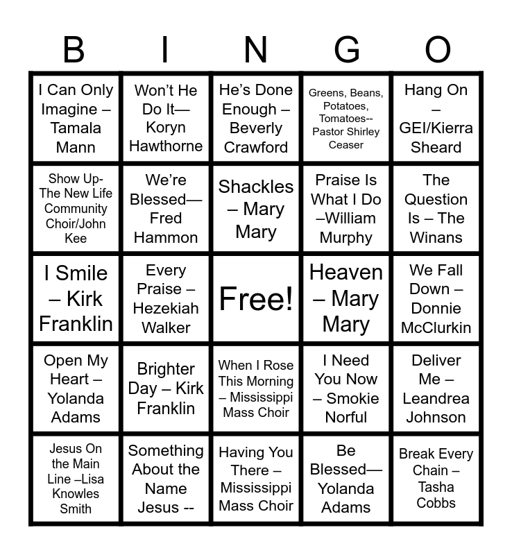This bingo card has a free space and 61 words: Stomp --Kirk Fanklin, Something About the Name Jesus --, The Presence of The Lord is Here—Byron Cage, Open My Heart – Yolanda Adams, Be Blessed—Yolanda Adams, No Weapon Formed Against Me Shall Prosper—Fred Hammon, We’re Blessed—Fred Hammon, Never Would Have Made It –Marvin Sapp, Praise Is What I Do –William Murphy, You Brought The Sunshine – Clark Sisters, Greens, Beans, Potatoes, Tomatoes--Pastor Shirley Ceaser, Jesus Is Real—The New Life Community Choir, Show Up- The New Life Community Choir/John Kee, If It Had Not Been For The Lord On My Side—Helen Baylor, Joy – Whitney Houston, I Can Only Imagine – Tamala Mann, Break Every Chain – Tasha Cobbs, Hang On – GEI/Kierra Sheard, God In Me – Mary Mary, Shackles – Mary Mary, Heaven – Mary Mary, He’s Done Enough –Beverly Crawford, Jesus On the Main Line –Lisa Knowles Smith, Deliver Me –Leandrea Johnson, Encourage Yourself –Donald Lawrence, The Best Is Yet To Come –The Tri City Singers, Addictive Love – BeBe Ce Ce Winans, Ain’t No Need To Worry – Anita Baker/The Winans, The Question Is – The Winans, We Must Praise –J Moss, Trouble In My Way –The Soul Seekers, I Almost Let Go –Kurt Carr, Love Under New Management – Miki Howard, God’s Grace – Trinitee57, Won’t He Do It—Koryn Hawthorne, Lord – Trinitee57, How Much Can We Bear –Hezekiah Walker, Every Praise – Hezekiah Walker, Silver & Gold – Kirk Franklin, I Smile – Kirk Franklin, Melodies From Heaven—Kirk Franklin, Brighter Day – Kirk Franklin, We Fall Down – Donnie McClurkin, Looking For You – Kirk Franklin, I Need You Now – Smokie Norful, Blessings On Blessings – Anthony Brown, Bless The Lord – Tye Tribbit, His Blood Still Works – VaShawn Mitchell, Chasing After You – VaShawn Mitchell, When I Rose This Morning – Mississippi Mass Choir, Having You There – Mississippi Mass Choir, On Time God – Dottie Peoples, Love On The Radio – The Walls Group, Fix It – The Group Fire, Lord Do It For Me –Zacardi Cortez, Let Go – Dewayne Woods, More Than Anything – John Kee, Jireh – Chandler Moore/Naomi Raine, Jesus Will –Anita Wilson, Nobody Like You Lord – Maranda Curtis and Take Me To The King – Tamala Mann/ Kirk Franklin.