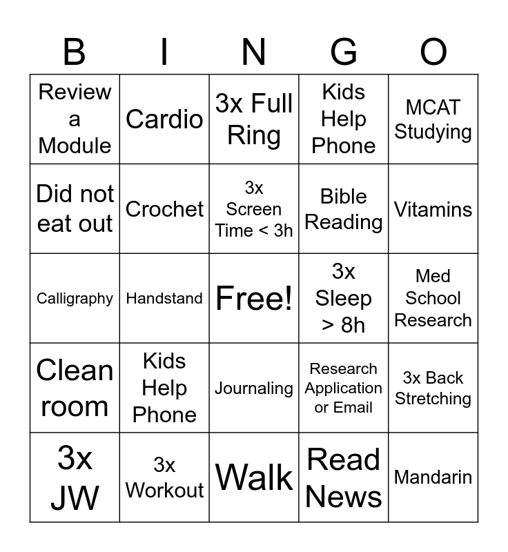 This bingo card has a free space and 24 words: Kids Help Phone, 3x Workout, 3x Screen Time < 3h, 3x JW, MCAT Studying, Review a Module, Did not eat out, Cardio, 3x Sleep > 8h, Journaling, Bible Reading, Calligraphy, Research Application or Email, 3x Back Stretching, Crochet, Read News, Med School Research, 3x Full Ring, Vitamins, Handstand, Mandarin, Clean room, Kids Help Phone and Walk.