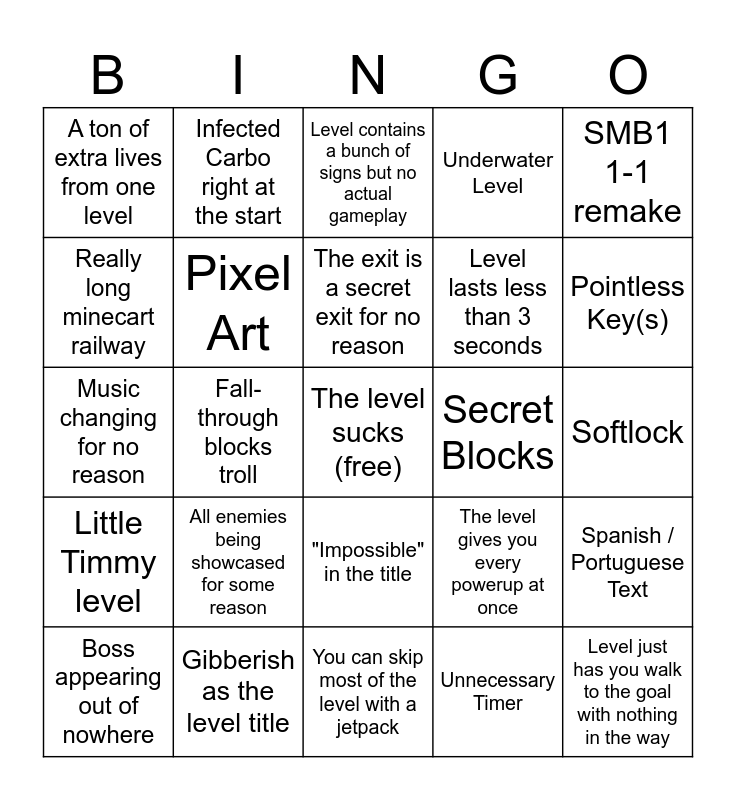 This bingo card has a free space and 24 words: Boss appearing out of nowhere, All enemies being showcased for some reason, The exit is a secret exit for no reason, Unnecessary Timer, SMB1 1-1 remake, A ton of extra lives from one level, Infected Carbo right at the start, Level contains a bunch of signs but no actual gameplay, Secret Blocks, Softlock, Music changing for no reason, Pixel Art, The level gives you every powerup at once, Spanish / Portuguese Text, Really long minecart railway, Gibberish as the level title, You can skip most of the level with a jetpack, Underwater Level, Pointless Key(s), Little Timmy level, Fall-through blocks troll, "Impossible" in the title, Level lasts less than 3 seconds and Level just has you walk to the goal with nothing in the way.