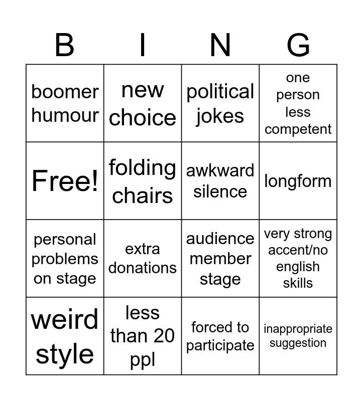 This bingo card has 16 words: less than 20 ppl, very strong accent/no english skills, political jokes, boomer humour, personal problems on stage, new choice, audience member stage, forced to participate, Free!, folding chairs, weird style, one person less competent, extra donations, longform, awkward silence and inappropriate suggestion.