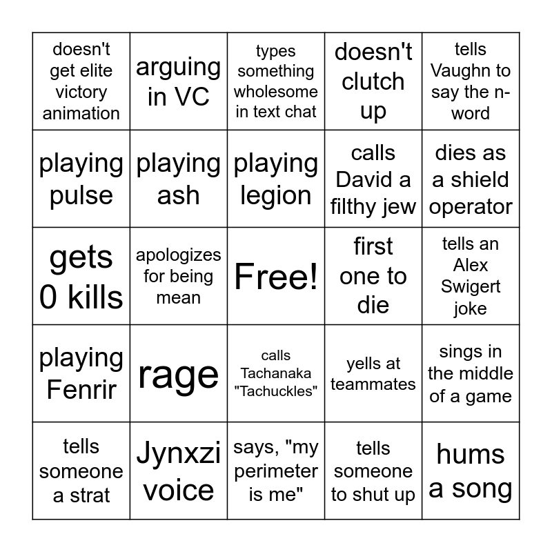 This bingo card has a free space and 24 words: rage, Jynxzi voice, playing legion, tells someone a strat, tells Vaughn to say the n-word, doesn't get elite victory animation, playing pulse, arguing in VC, first one to die, calls Tachanaka "Tachuckles", calls David a filthy jew, gets 0 kills, yells at teammates, sings in the middle of a game, playing ash, tells someone to shut up, tells an Alex Swigert joke, types something wholesome in text chat, dies as a shield operator, apologizes for being mean, hums a song, playing Fenrir, doesn't clutch up and says, "my perimeter is me".