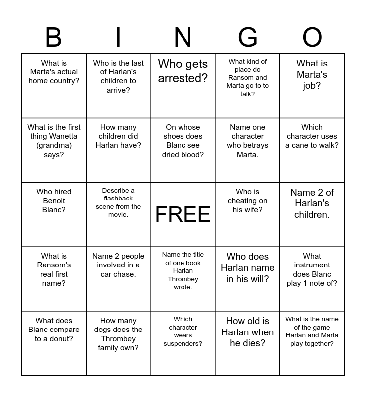 This bingo card has a free space and 29 words: What does Blanc compare to a donut?, What makes Marta vomit?, Describe a flashback scene from the movie., Name one piece of physical evidence in the case., What is Marta's actual home country?, Who gets arrested?, How many children did Harlan have?, Name 2 people involved in a car chase., Who is cheating on his wife?, How many dogs does the Thrombey family own?, Name 2 of Harlan's children., What is the name of the game Harlan and Marta play together?, Which character wears suspenders?, How old is Harlan when he dies?, Which character uses a cane to walk?, What building is set on fire?, Name the title of one book Harlan Thrombey wrote., What is Ransom's real first name?, What is Marta's job?, Who hired Benoit Blanc?, Who does Harlan name in his will?, Who runs Harlan's publishing company?, Name one character who betrays Marta., What is the first thing Wanetta (grandma) says?, What kind of place do Ransom and Marta go to to talk?, Who is the last of Harlan's children to arrive?, What instrument does Blanc play 1 note of?, On whose shoes does Blanc see dried blood? and Name a character who smokes cigarettes..