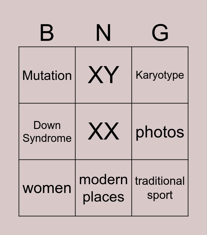 This bingo card has a free space and 18 words: Chromosome, Trisomy 21, Karyotype, Mutation, Recombinant DNA, Down Syndrome, Gene, XY, modern places, traditional places, modern sport, traditional sport, traditions, photos, women, different, clothes and objects.