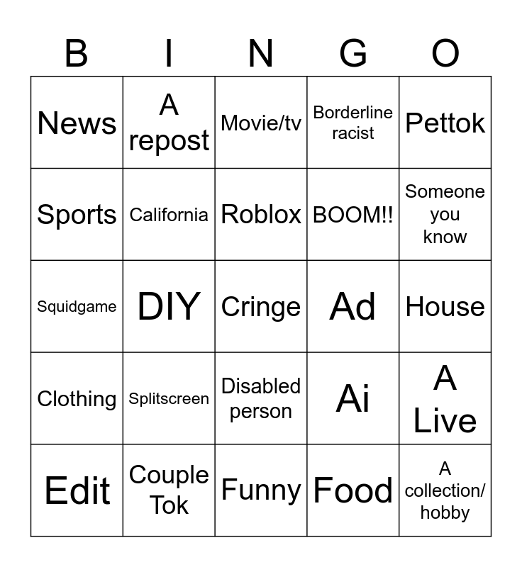 This bingo card has a free space and 24 words: Splitscreen, Couple Tok, Roblox, Edit, Pettok, News, Sports, A repost, Ad, Disabled person, BOOM!!, Squidgame, Ai, A Live, California, Food, House, Movie/tv, Someone you know, DIY, A collection/ hobby, Clothing, Borderline racist and Funny.