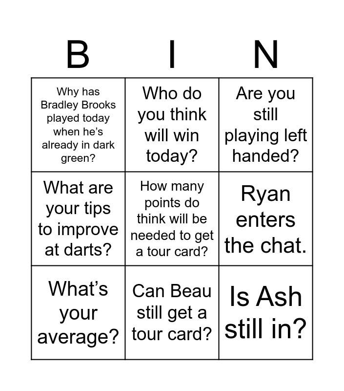 This bingo card has 9 words: What’s your average?, Are you still playing left handed?, Who do you think will win today?, What are your tips to improve at darts?, Why has Bradley Brooks played today when he’s already in dark green?, Ryan enters the chat., How many points do think will be needed to get a tour card?, Is Ash still in? and Can Beau still get a tour card?.