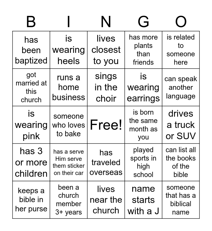 This bingo card has a free space and 24 words: has a serve Him serve them sticker on their car, been a church member 3+ years, sings in the choir, keeps a bible in her purse, is related to someone here, has been baptized, got married at this church, is wearing heels, is born the same month as you, has traveled overseas, is wearing earrings, is wearing pink, played sports in high school, can list all the books of the bible, runs a home business, name starts with a J, drives a truck or SUV, lives closest to you, can speak another language, someone who loves to bake, someone that has a biblical name, has 3 or more children, has more plants than friends and lives near the church.